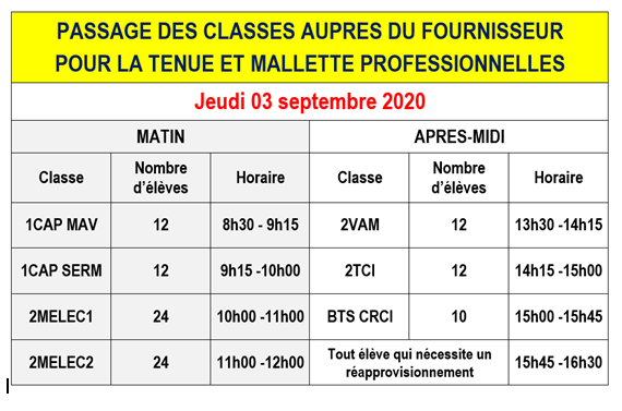 Organisation des récupérations de la tenue professionnelle et de la mallette pour certaines classes :