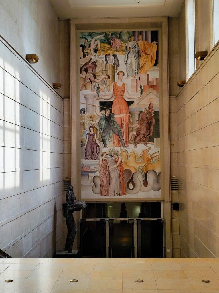 Le groupe est assis dans le grand escalier, face à la médiatrice. Au fond la fresque monumentale "Comédie".