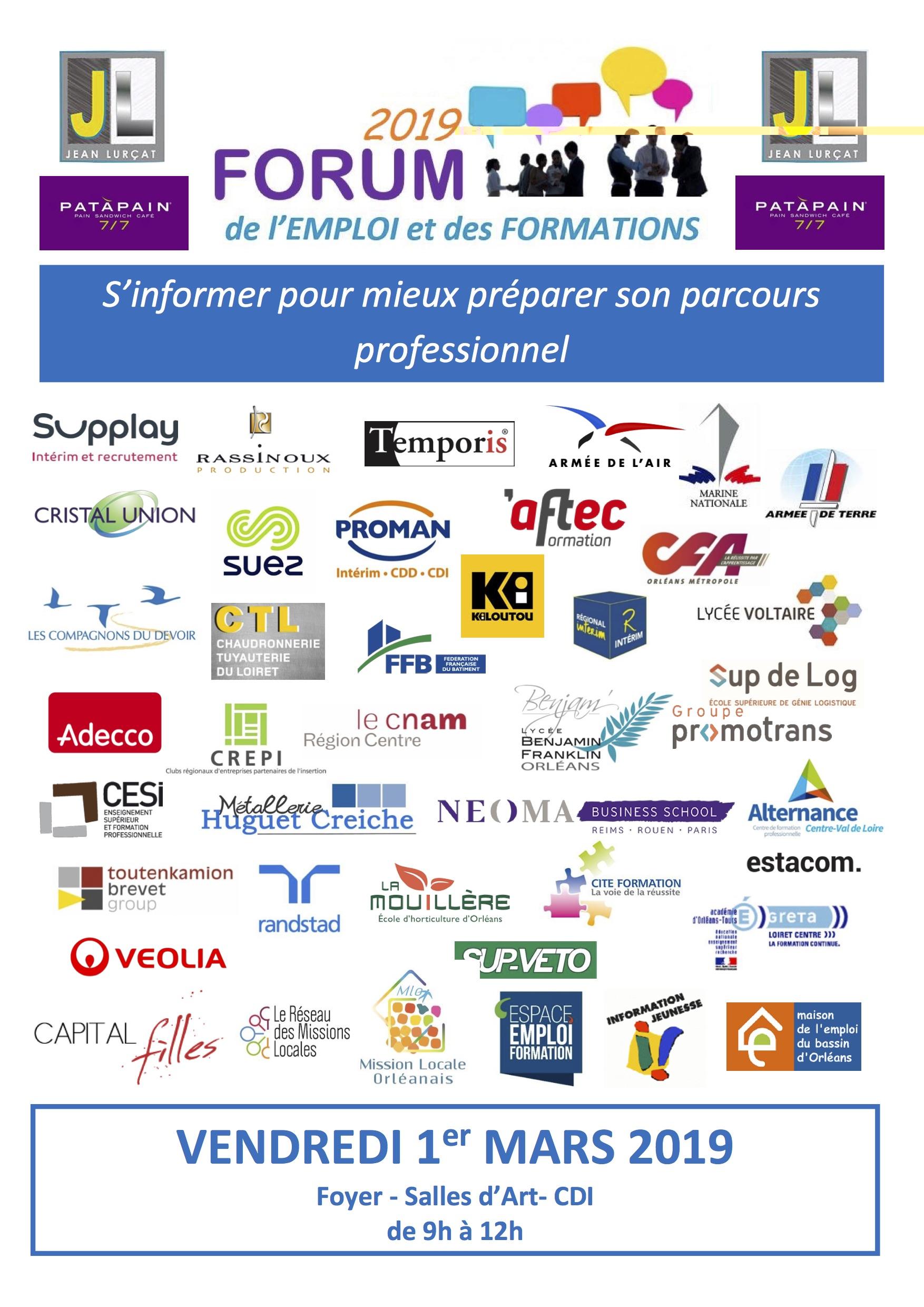 Le forum de l’emploi et des formations : Vendredi 1er mars 2019 de 9H00 à 12H00 au sein du lycée.