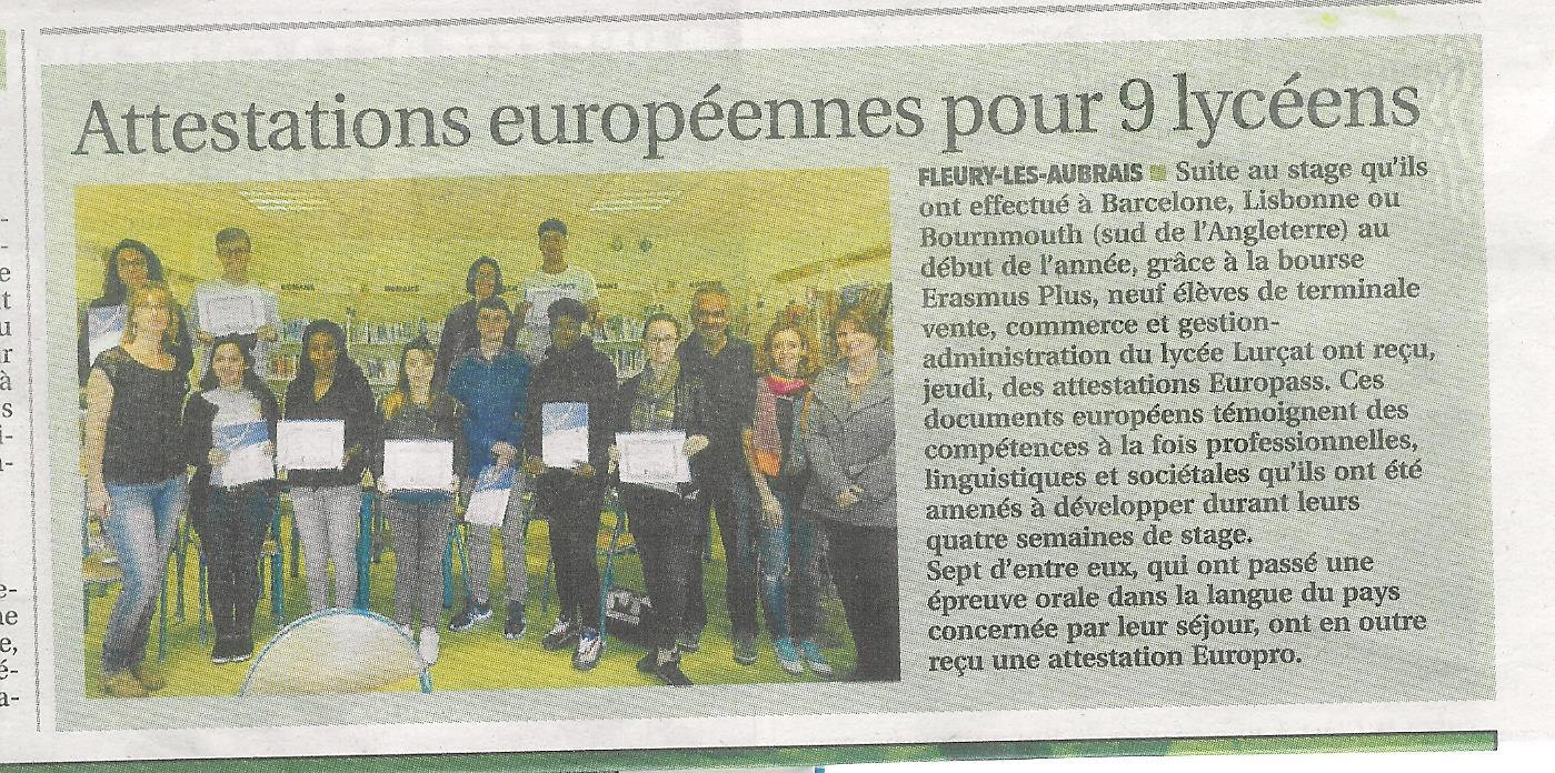 Les élèves du lycée Jean Lurçat ayant fait leur stage professionnel à l’étranger ont reçu leurs certificats. Cette année ils ont pu découvrir l’Espagne, le Portugal et l’Angleterre grâce à l’aide de nos partenaires, Maria sur Lisbonne;  Jordi, Iolanda et Pablo sur Barcelone.  Les certificats divers ont été remis lors de la venue d’un des  lycées partenaires espagnols. Iolanda et Pablo ont ainsi pu revoir les stagiaires français et les encourager pour leurs examens. Pour la première fois cette année, le lycée Jean Lurçat s’est également occupé de l’organisation des stages en France pour nos partenaires. Le bilan est tout à fait positif pour chaque participant.